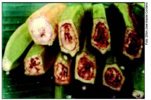 Esta é considerada a mais severa, pois sua ocorrência afeta a absorção e o transporte de água e nutrientes para a parte aérea da planta. É causada pelo fungo Fusarium oxysporum f. sp. cubense. É disseminado principalmente por mudas contaminadas, água de irrigação, máquinas e implementos agrícolas. Internamente, num pseudocaule cortado, pode ser observada descoloração vascular pardo-avermelhada enquanto que externamente, nas folhas, ocorre um amarelecimento progressivo das folhas mais velhas para as mais novas que culminam com a murcha, seca e quebradas mesmas junto ao pseudocaule.